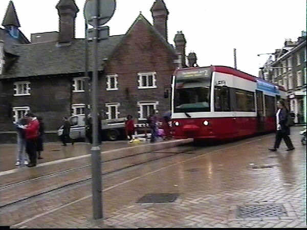 part of the tramway is in a pedestrianised area. The white cross is a tram