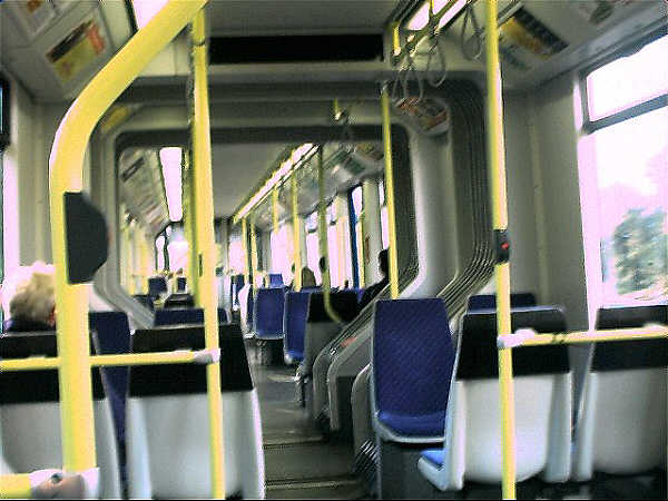 The inside of a Croydon tram. There is room for 200 passengers inside,