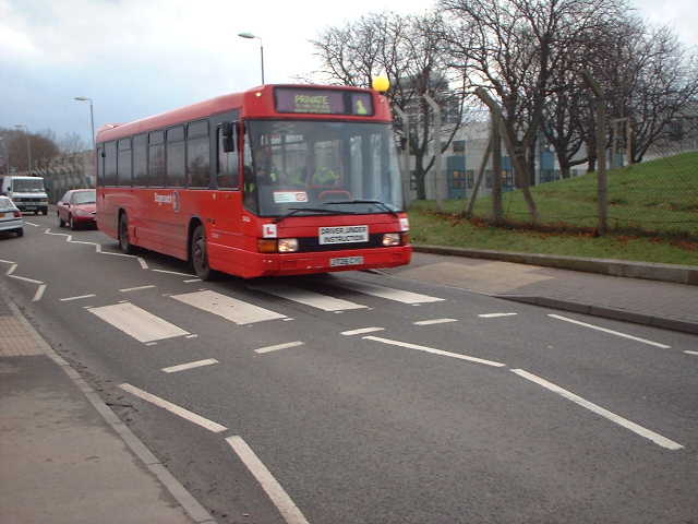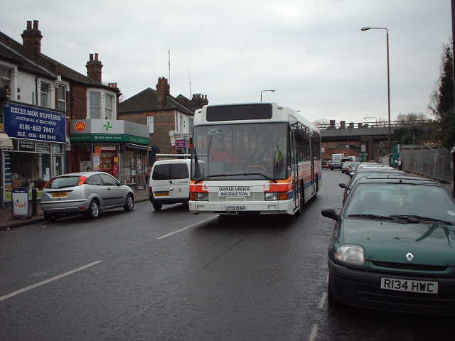 compared to London red. Behind the bus is the railway bridge to Eltham