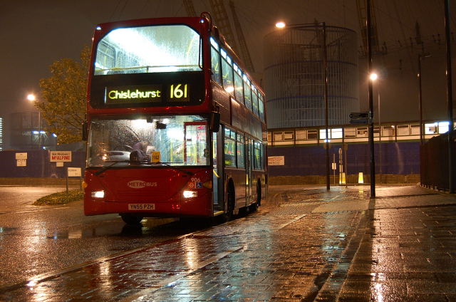 A wet evening at the Dome in Greenwich, Metrobus 906 is on route 161.