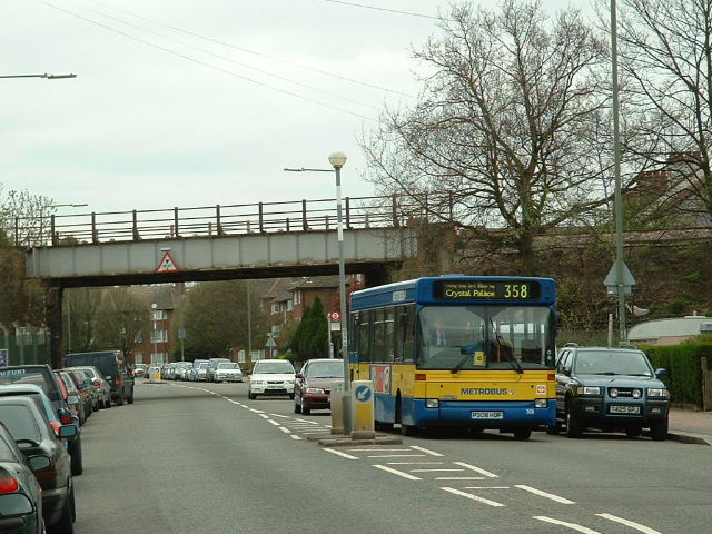 Bromley, Farnborough, Green Street Green, Orpington Station. Seen here.in Upper Elmers End Road, having just passed under the railway bridge between Elmers End and Eden Park stations. 6 April 2003. Photograph. John King. |