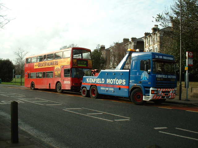 Halfway Street, Sidcup. The bus is now ready to be towed by On Time (Kenfield)
