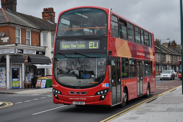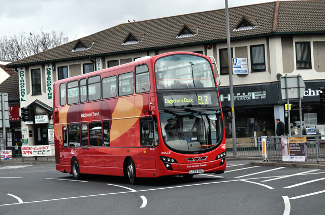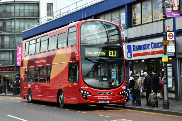 opposite Barking Station is Blue Triangle WVL342 on route EL1, this bus