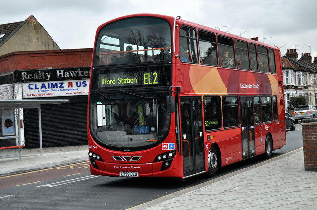 Seen here in Fanshawe Aveunue, Barking is Blue Triangle WVL341 on route EL2 off to Ilford Station. 27 March 2010. Photograph. John King. |