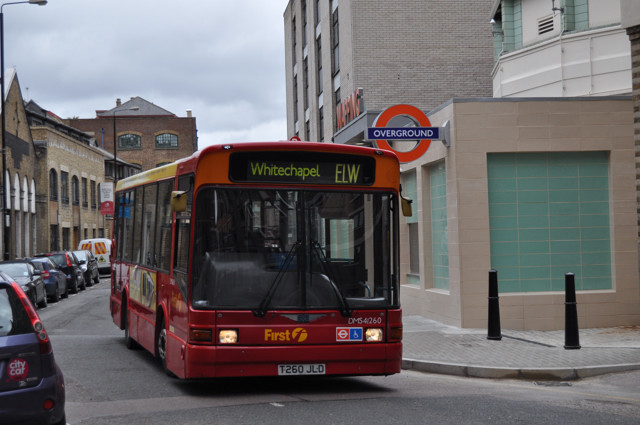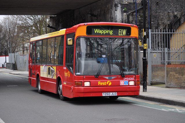 First DMS41260 on route ELW passing under the railway bridge in Cannon Street Road, bound for Wapping. 5 April 2010. Photograph. John King. |