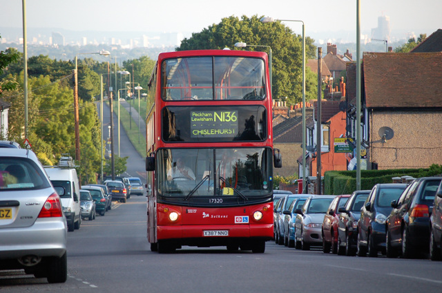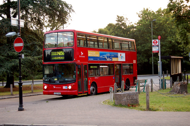Selkent 17330 is seen at the Chislehurst War Memorial stand on route N136 in the early morning light. 14 June 2009. Photograph. John King. |