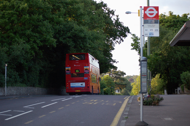 With a backdrop of London Selkent 17320 climbs White Horse Hill nearing the end of the journey on route N136. 14 June 2009. Photograph. John King. |