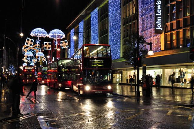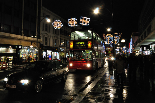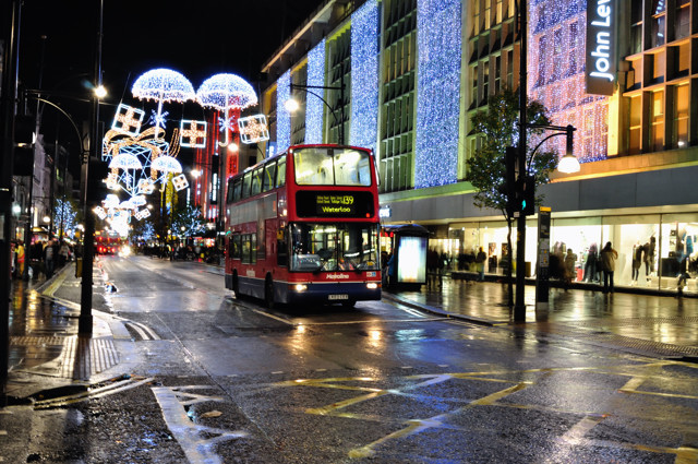 Metroline TP407 is on route 139 seen in a wet Oxford Street early on a Sunday evening. 29 November 2009. |