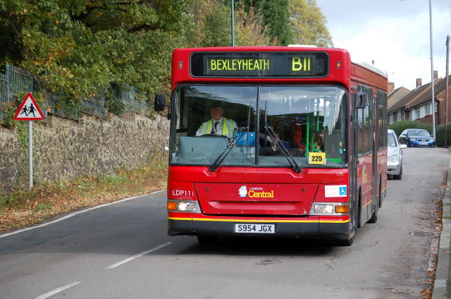 London Central LDP111 on route B11, seen in Lodge Hill. The wall on