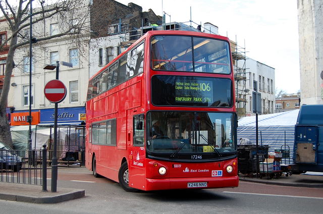 East London 17246 on route 106 seen turning out of Fulbourne Street
