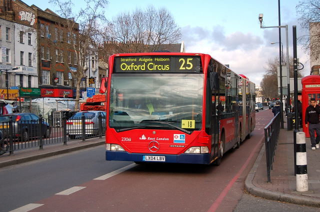 East London 23061 on route 25 in Whitechapel Road on Tuesday 20 March