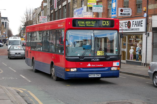 East London 34208s on route D3 seen in New Road, about to cross Whitechapel