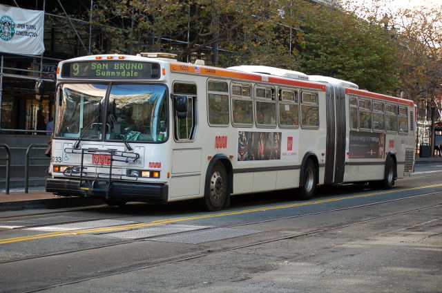 Muni 6233 an articulated bus running along Market Street on route 9.