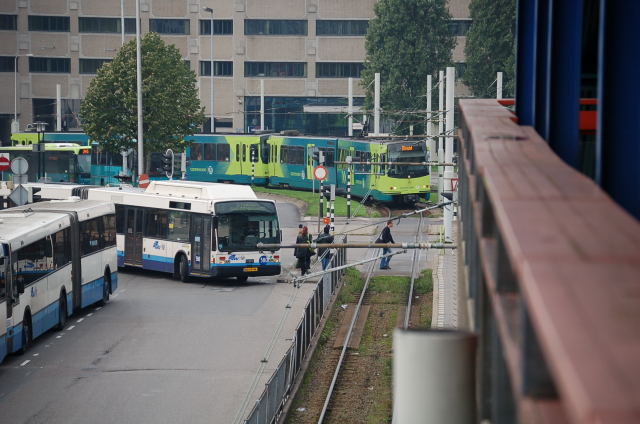 Buses and a tram outside Utrecht Central Station. The tram in the picture