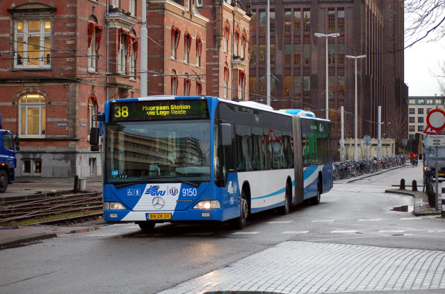 GVU 9150 an articulated bus on route 38 aproaching Utrect bus station.