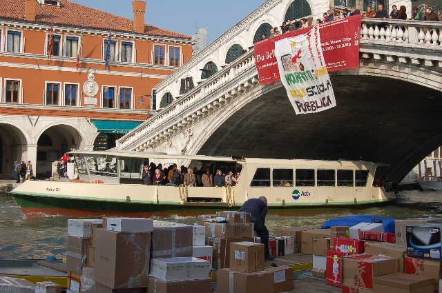 ACTV 21 passing under Ponte Rialto on line 1. In the foreground a delivery