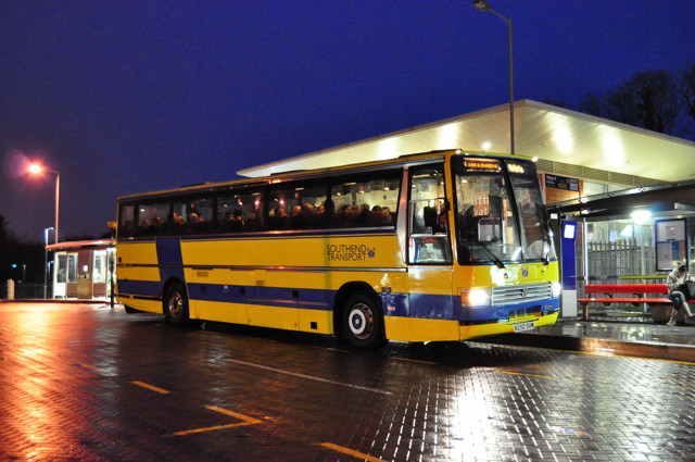 Ex Southend Transport A250SVW is again on route X80, Greenhithe staton is illuminated behind the bus. 5 December 2009. Photograph. John King. |