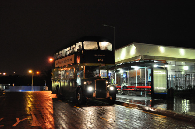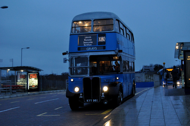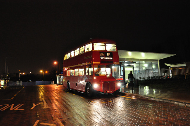 Greenhithe Station again after dark. This time RMC1485 is on route X80. 5 December 2009. Photograph. John King. |