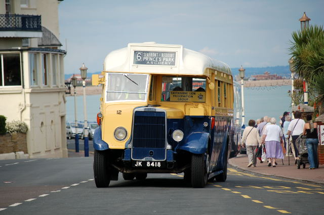 Eastbourne Corporation 12 (JK 8418) running on the Seafront Service No. 6. Seen at Eastbourne Pier. This bus belongs to the Eastbourne Lion Preservation Club. |