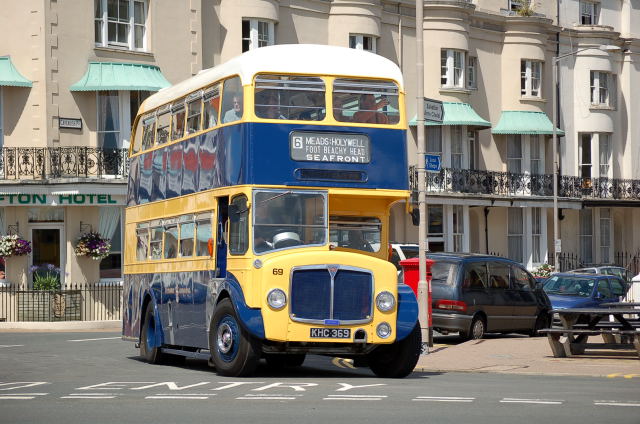 Seen at Eastbourne Pier is Eastbourne Corporation 69 (KHC 369) again on route 6 the Seafront service. |