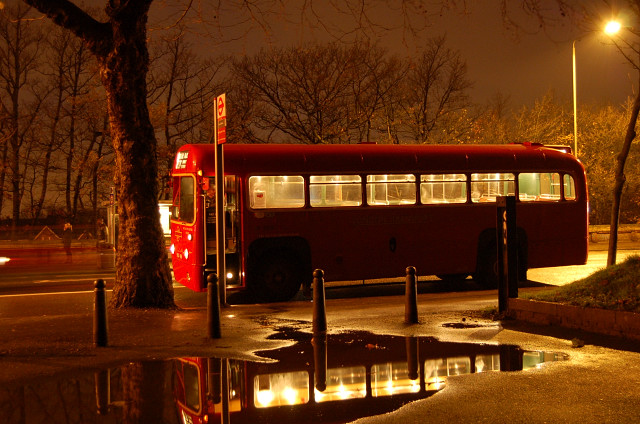 RF489 seen here at Crystal Palace on route 227, making reflection is