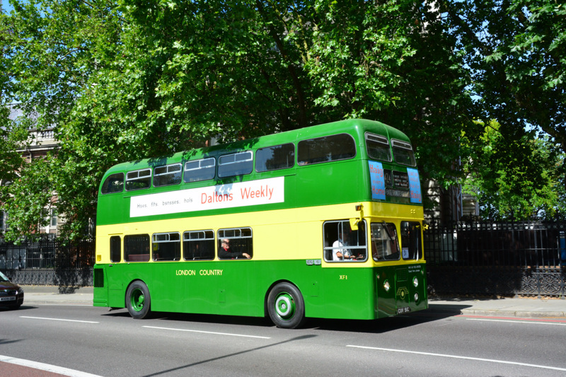 XF1 seen in 2014, it is now in a London Country livery, seen on the year of the bus cavalcade in Lambeth Palace Road. 22 June 2014. Photograph. John King. |