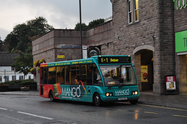 Trent Barton 488 (FE02KDU) is outside Matlock Market on route 6.1. This bus carries all over advertisements for Mango Tickets. 25 August 2010. Photograph. John King. |