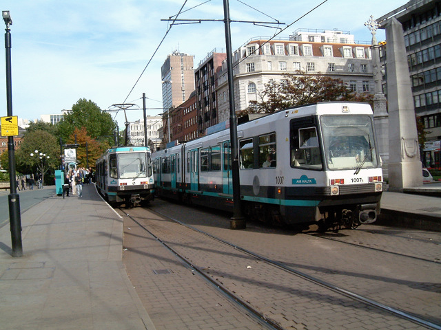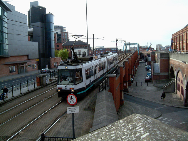 Metrolink 1025 seen coming off the bridge into Lower Mosely Street. 15 October 2003. Photograph. John King. |