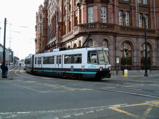 Metrolink 1017 named Bury Hospice seen crossing Oxford Street from Lower Mosely Street into St. Peter's Square. 15 October 2003. Photograph. John King. |