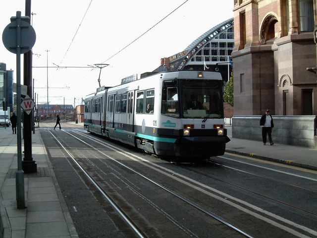 Metrolink 1010 seen in Lower Mosley Street with the Manchester Central Conference and Exhibition centre seen behind. 15 October 2003. Photograph. John King. |