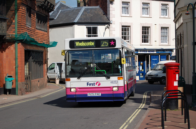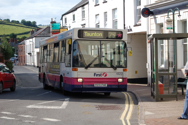 Seen in North Street, Wiveliscombe is First 46251 on route 25 on the way to Taunton. 30 June 2009. Photograph. John King. |