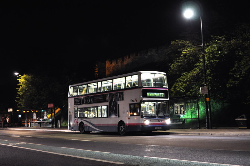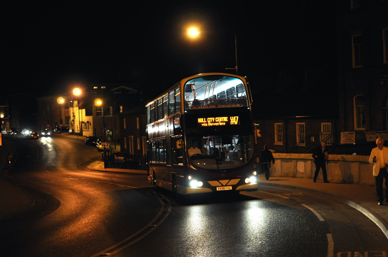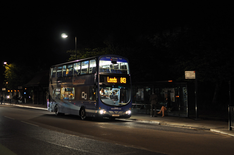 Yorkshire Coastliner FJ08BYX, seen after dark outside York station on route 843. 6 May 2011. Photograph. John King. |