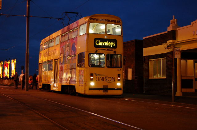 The Trade Union Unison advertisement is carried by Blackpool 762 seen