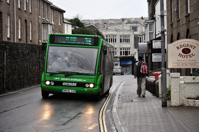 Western Greyhound 911 on route 516 climbing Tregenna Hill, St. Ives. 21 November 2009. |