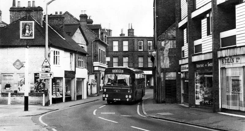 SMA13 is seen on Greenline route 725 in Bexley Village 1973. Greenline 725 was inaugarated on 1 July 1953 between Dartford and Windsor, and later extended from Dartford to Gravesend. The 725 service was a 'London orbital' route, commencing at Gravesend and travelling via Dartford, Bexley, Bromley, Croydon and Hampton Court to Windsor. |