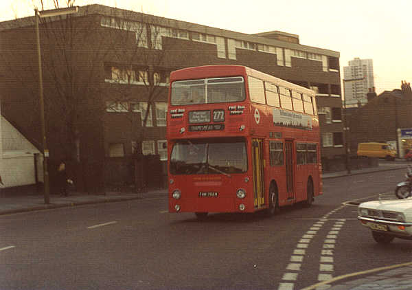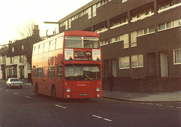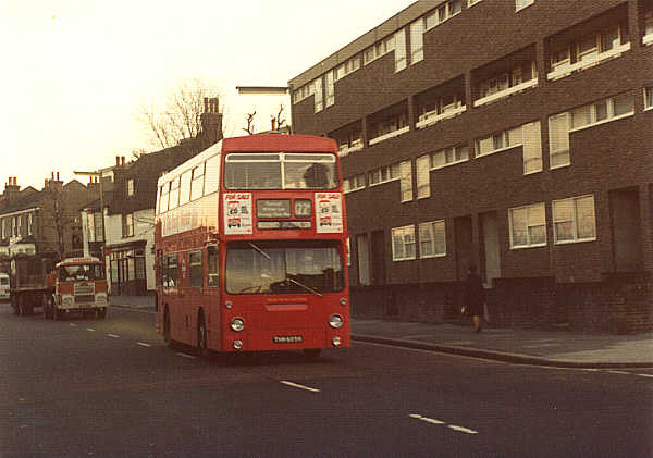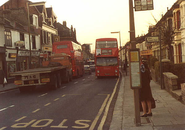 On service 122a. In Plumstead High Street, en-route to Woolwich. December 1974 The DMS had taken over the 99 and 122a on 10 November 1974 after the MBs had been withdrawn. Photograph. John King |