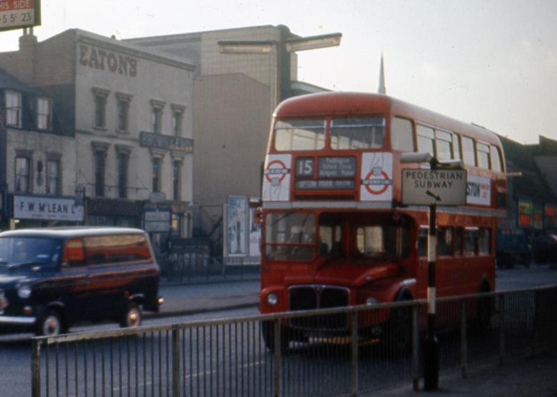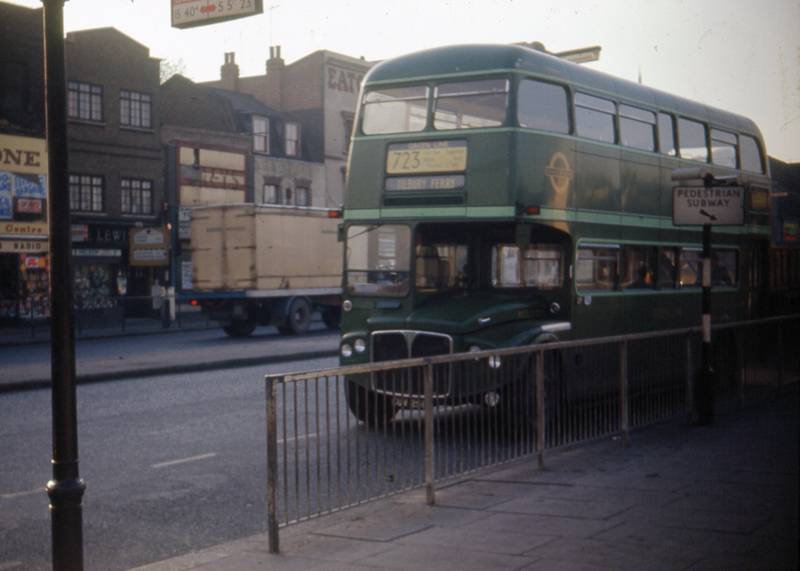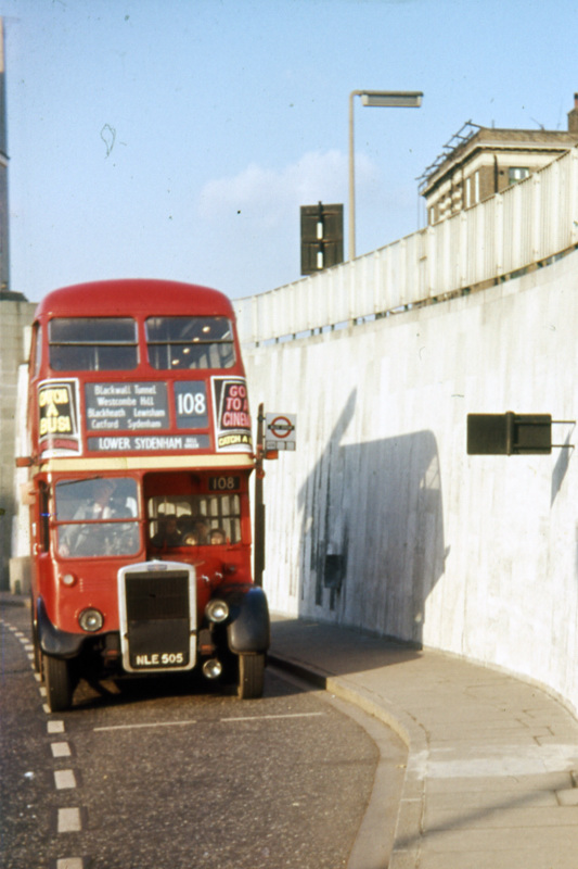 Service 108. Poplar - Lower Sydenham, via Blackwall Tunnel. Seen here on the Northern approach to Blackwall Tunnel. This photograph is on the road below the one in the picture above. The RTLs were newer than the RTs, but somehow looked more dated. October 1967. Photograph. John King |
