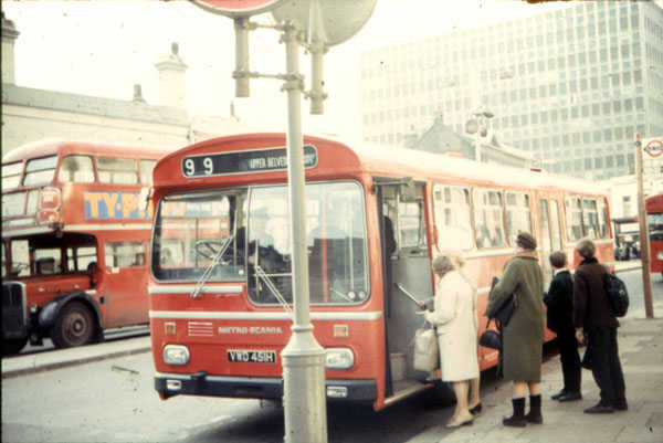 Since the prototype was an MCW demonstrator (made in Birmingham) it would have carried a 'local' registration number, hence the Warwickshire index. MCW stands for Metro Cammell Weymann, and this was an amalgam of two company's, Weymann and Metro-Cammell which had previously been Cammell-Laird just to complicate matters! Scania-Vabis is the full, correct name for the Swedish commercial vehicle manufacturer who also make Saab cars. Metro-Scania was just a name coined by MCW to reflect the combination of Scania running units with bodywork by MCW. Several minor, but unspecified modifications were made to VWD prior to service with LT to make it suitable for service in London and in order to gain experience by operating it in comparison with MB types. LT was its first port of call. It is often quoted as being used on a three month trial when in fact it entered service on the Monday following conversion of routes 99/122a on 24 January 1970 and was gone by the end of March. It ran on route 99 only during weekdays, and not at all at weekends (Sunday workings were from Abbey Wood using RMs. The central exit was cordoned off for the first couple of weeks of operation, and when finally put into use, had leafs which opened outwards either side of the doorway, rather than the usual jacknife arrangement. The bell-push was a continuous plastic strip along the entire length of the nearside, and their were 40 seats with provision for 20 standing. *Paul Harley says that one of these two buses was definitely loaned to Newport Transport Many thanks to Anthony Wilson and Steve Thoroughgood for gathering much of the information used on this page. |
