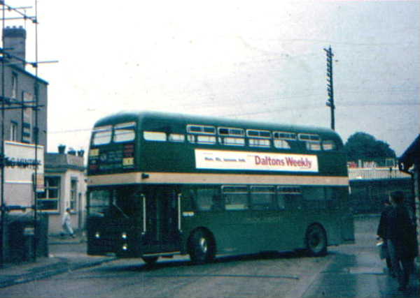 XF6. CUV 56C. Seen on route 424 at Reigate Station. In the 1960s London Transport ran trials with Daimler Fleetlines on the country area routes. The Fleetlines were designated XF. This photograph captures the mood of times now gone. |