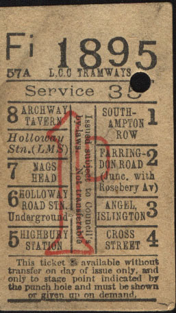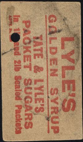 LCC tram ticket for service 35, which was one of the routes which crossed from North to South London via the Kingsway subway. However this ticket only shows destinations from Archway to Southampton Row. This means this ticket was issued prior to 1906 when the subway was partly opened. Or while it was closed for enlargement for double deck cars between 3 February 1930 and 14 January 1931. The reverse shows an add for Lyle's Golden Syrup. |