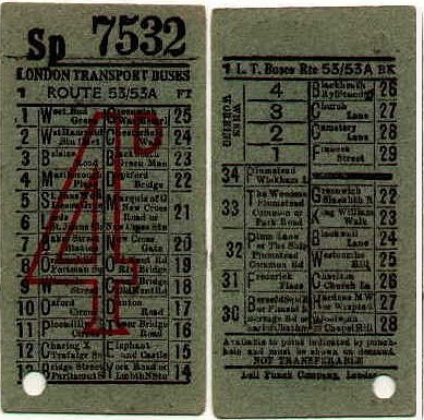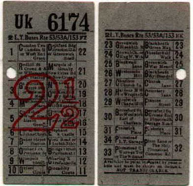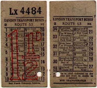 Routes 53 and 53a from Plumstead, Wickham Lane to West End Green, Hampstead. They seem to show the route from Plumstead Common and then via Woolwich and Charlton lower road to New Cross rather than Charlton Village and Blackheath. The ticket below is for 53, 53a and 153. The destinations are from Camden Town to either Plumstead LT Garage or Plumstead Common Warwick Terrace, via either Greenwich and Woolwich or Blackheath, Charlton and Woolwich. |