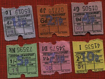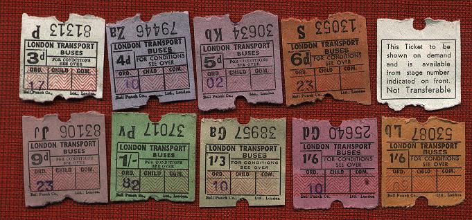 Tickets issued on route 99 MB (Merlin Buses) o.m.o. services from Plumstead (AM). The stage boarded is printed in the ticket type box. e.g. ORD, CHILD or COM.. Those below have been overprinted in blue with the appropriate decimal values ready for February 15 1971. These ticket types were issued 1969-72 are Bell Punch Ultimate type |