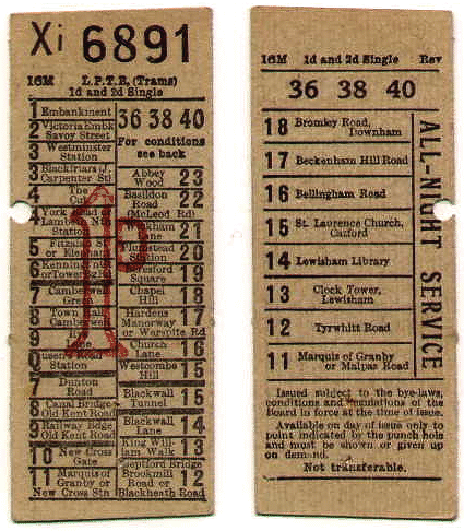 Embankment, Savoy Street. On the reverse of the ticket the all night service