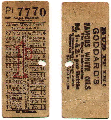 Tickets for tram services 44 Woolwich-Eltham and 46. Woolwich- City, Southwark. via Eltham. The tracks from Woolwich to Eltham were common for both routes. As can be seen through fares could be booked on depot runs. These and those below were the last tram routes to run in London. They were withdrawn on 5 July 1952. Space can be seen on the back of the ticket has been utilised for advertisements. |