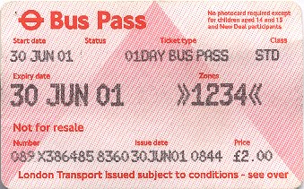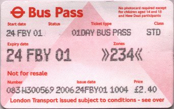 Above:- A modern bus pass for zones 2, 3, 4. Cost £2.40 for one