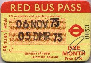Below a monthly bus pass from 1965. Price £7.50 for a whole months bus travel. This in the days before zones and when tickets were made from thick cardboard instead of thin card. |