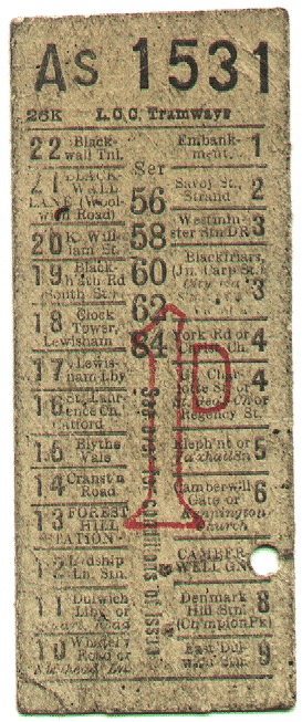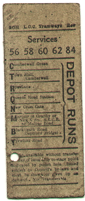 Services 56, 58, 60, 62, 84. These services shared parts of the route with each other. On the back of the ticket can be some of the fare stages used on depot runs. The trams were in service when travelling 'off route' to the depots, through fares to destinations on the usual route could be paid for. 56. Peckham Rye-Victoria Embankment 58. Blackwall Tunnel-Victoria Station. 60. Dulwich Library-City (Southwark) 62. Blackwall Tunnel- Victoria Embankment (Savoy Street) 84. Peckham Rye-Victoria Embankment The 185 bus replaced the 58 tram. and the 184 bus replaced the 84 tram in 1952. ticket enlarged |