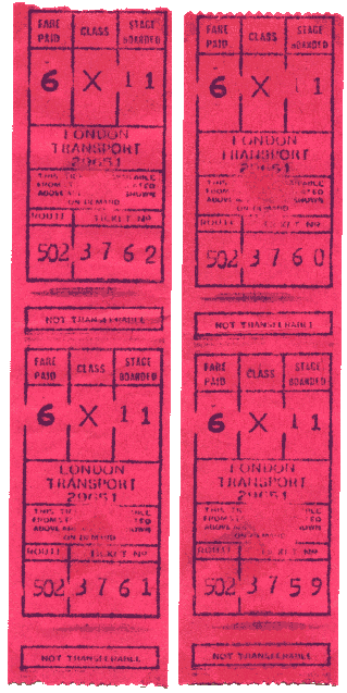 The tickets above date from around late 1970, they are ready for decimal the 'd' has been left off the price. The flat fare was 6d. London Transport were worried that after decimalisation (Feb 15 1971) there would be no coin to pay this fare with. A campaign was launched by newspapers of the day with the slogan 'Save our Sixpence'. This led to the retention of the sixpence as a two and a half pence coin. They needn't have worried by 1974 the fare had doubled to 5p, and by 1976 it had doubled again to 10p. Also within a few weeks of decimalisation most of the sixpenny coins were traveling in pairs as 5p. |