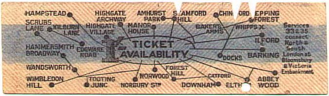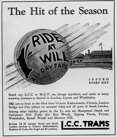 The famous Shilling All Day ticket was introduced in 1925 as an answer to the competition from the motor bus rivals. London Transport carried on with them during the war. They were issued after 9.30am on Mondays to Fridays. People travelled all over with these tickets, some seeing just how many miles they could clock up. Others just taking a day out in the summer, to Hampstead Heath, Epping Forest or Abbey Wood, taking a picnic with them. When the trolleybuses came they were available on those as well. As the poster above says 390 cars an hour pass the oval. It was rumoured that for a shilling you could watch the best part of a days cricket at the oval from the top of a tram by riding past then getting one back the other way. |
