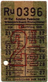 Geographic type ticket showing the destination in words as well as numbers. The 698 ran from Woolwich to Bexleyheath via Abbey Wood and Erith. The sister service 696 from Woolwich to Dartford via Welling and Bexleyheath. These routes were the only two in SE London, a little island cut off from the rest of the network. For more on these Trollybus routes, the trams they replaced and the